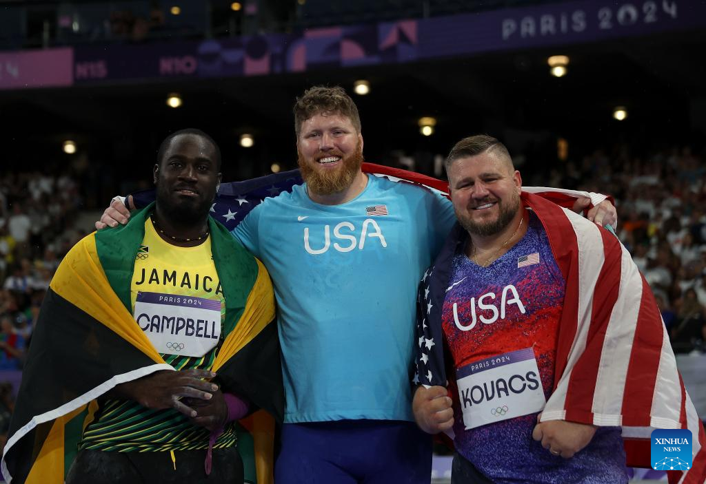 Ryan Crouser (C) and Joe Kovacs (R) of the United States pose with Rajindra Campbell of Jamaica after the men's shot put final of athletics at the Paris 2024 Olympic Games in Paris, France, Aug. 3, 2024. (Xinhua/Li Ming)