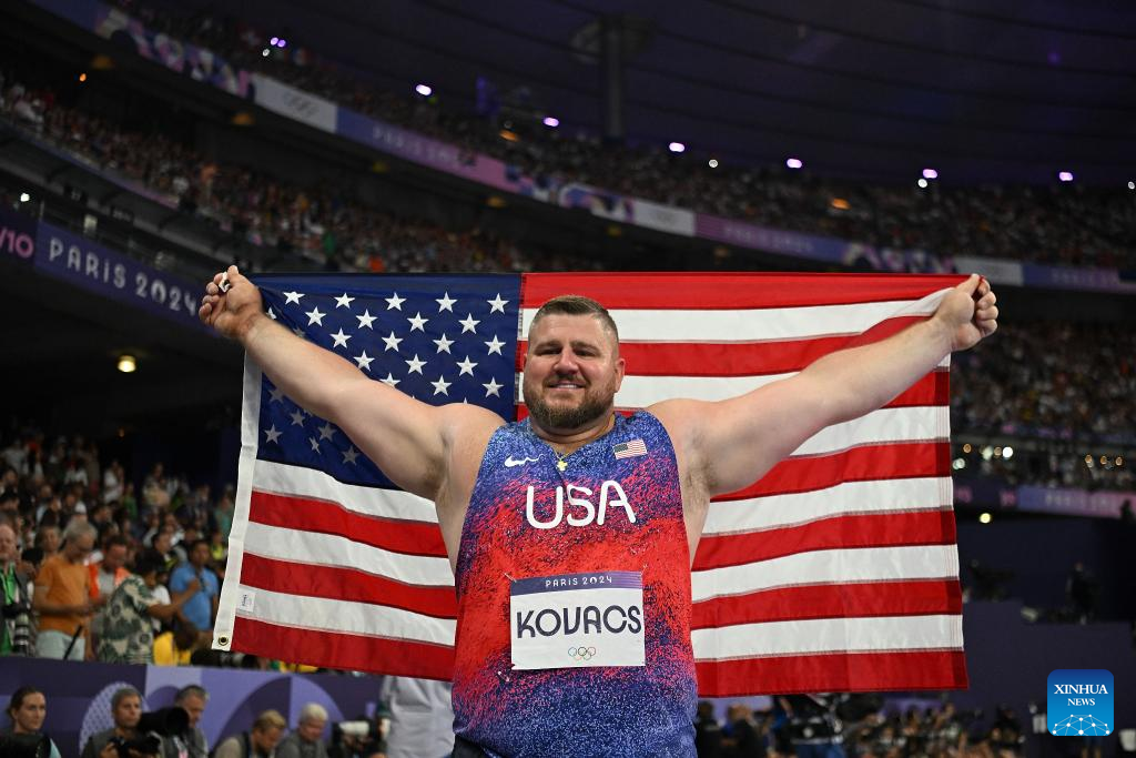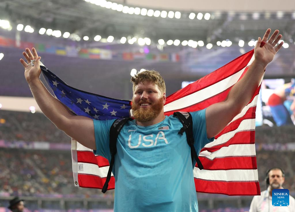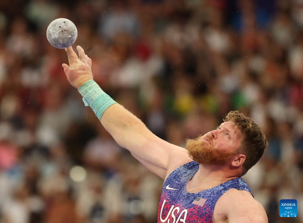 PARIS, Aug. 3 (Xinhua) -- American Ryan Crouser joined a select group of athletes when he clinched his third consecutive Olympic shot put title on Saturday.