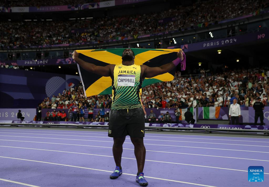 Rajindra Campbell of Jamaica celebrates after the men's shot put final of athletics at the Paris 2024 Olympic Games in Paris, France, Aug. 3, 2024. (Xinhua/Li Ming)