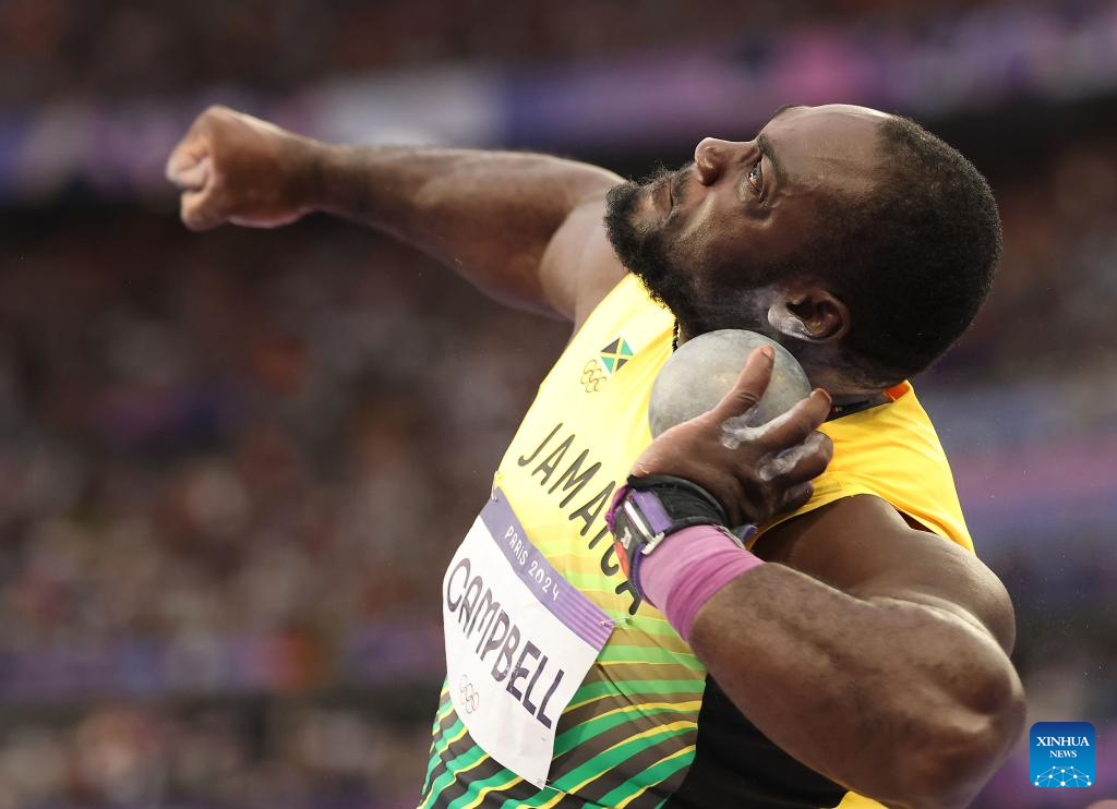 Rajindra Campbell of Jamaica competes during the men's shot put final of athletics at the Paris 2024 Olympic Games in Paris, France, Aug. 3, 2024. (Xinhua/Li Ming)