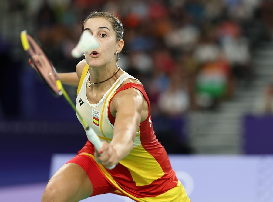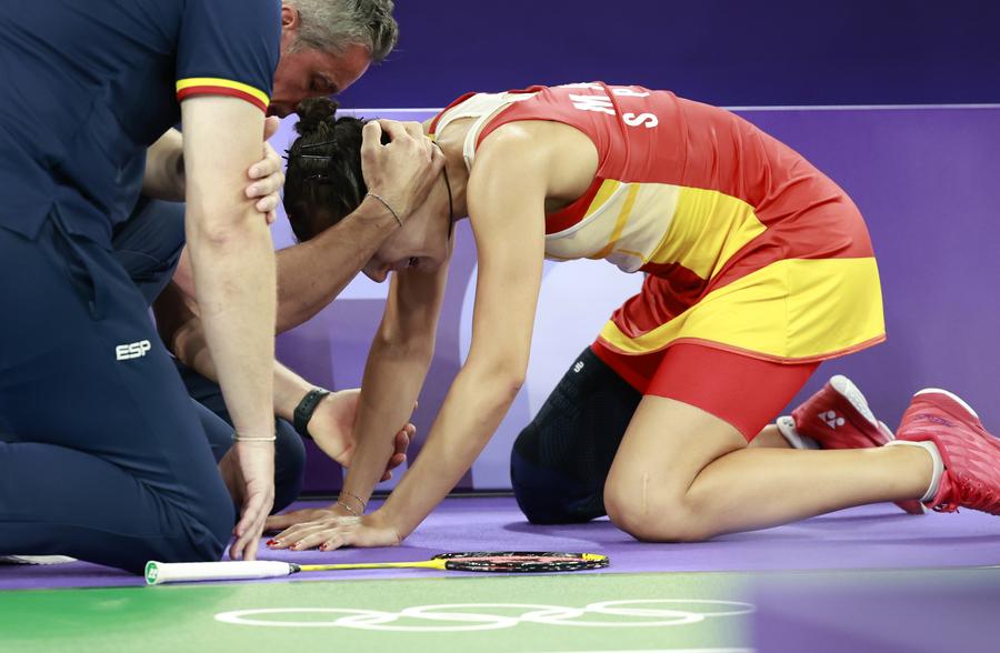 PARIS, Aug. 4 (Xinhua) -- Carolina Marin, the tenacious Spanish badminton star, donned her knee brace and stepped back onto the court, signaling her contender, He Bingjiao, to resume their semifinal match.