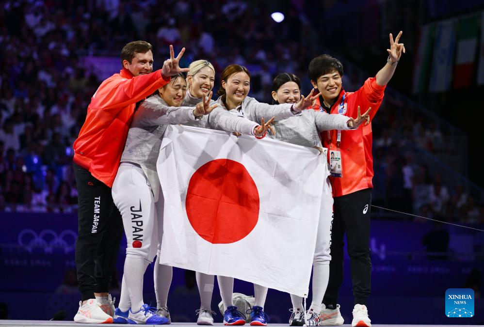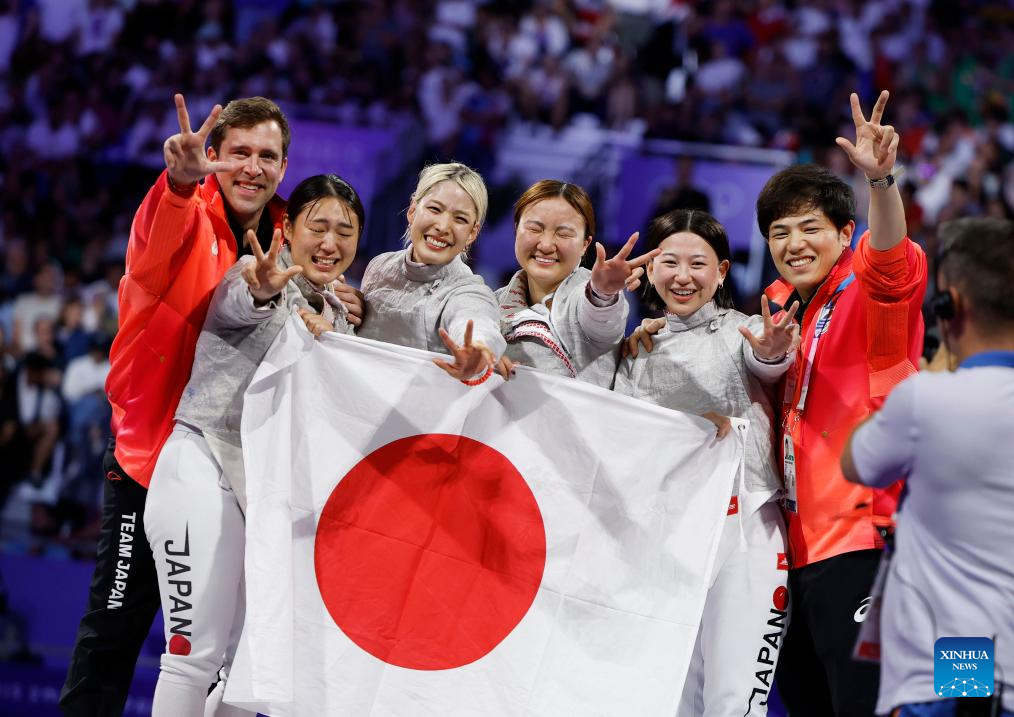 Team Japan celebrate victory after the women's sabre team bronze medal match of fencing between France and Japan at the Paris 2024 Olympic Games in Paris, France, Aug. 3, 2024. (Xinhua/Zhang Hongxiang)