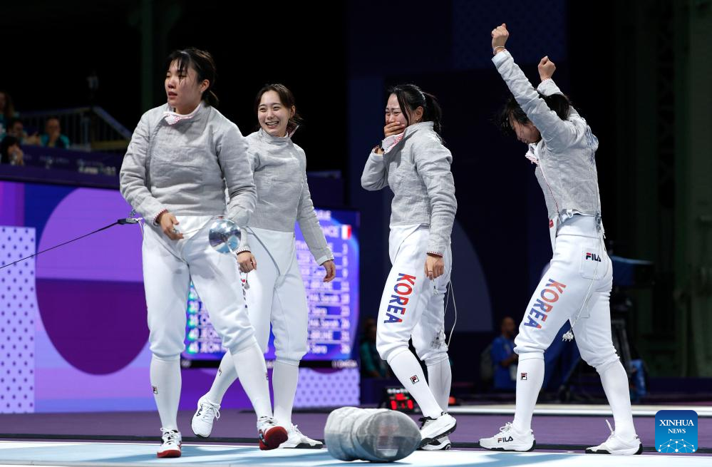 Team South Korea celebrate victory after the women's sabre team semifinal 1 of fencing between South Korea and France at the Paris 2024 Olympic Games in Paris, France, Aug. 3, 2024. (Xinhua/Fei Maohua)