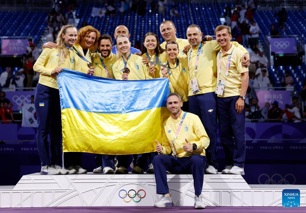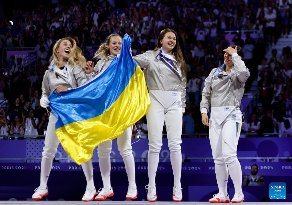 Team Ukraine celebrate victory after the women's sabre team gold medal match of fencing between Ukrain and South Korea at the Paris 2024 Olympic Games in Paris, France, Aug. 3, 2024. (Xinhua/Fei Maohua)