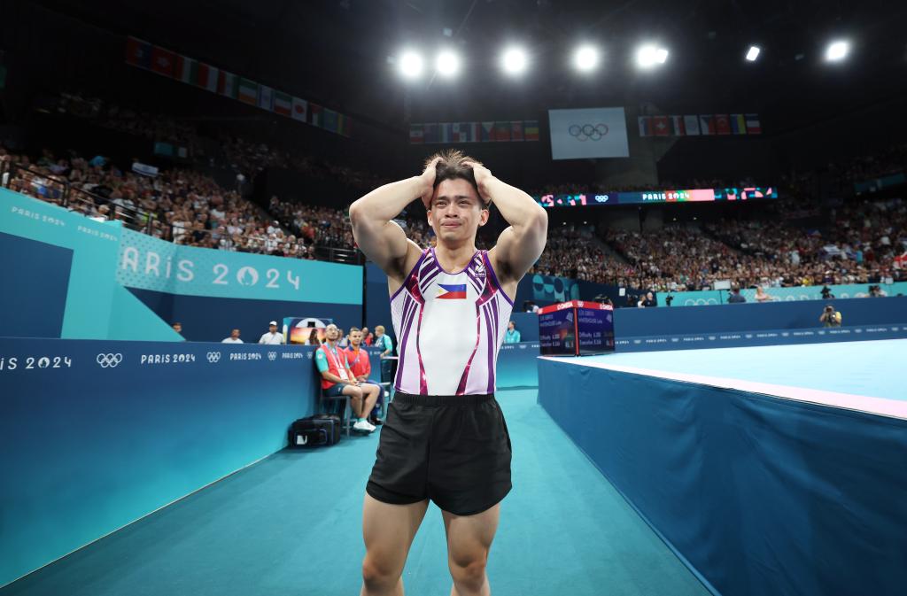 Yulo held his head in charming disbelief when the results came out. He later proudly showed to cameras the national emblem on his gym suit.