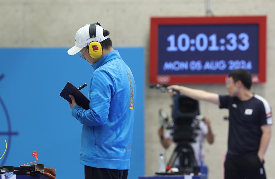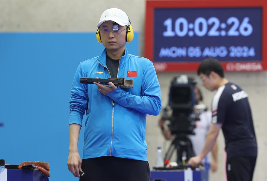 Li Yuehong of China competes during the 25m rapid fire pistol men's final of shooting at the Paris 2024 Olympic Games in Chateauroux, France, Aug. 5, 2024. (Xinhua/Zhao Dingzhe)