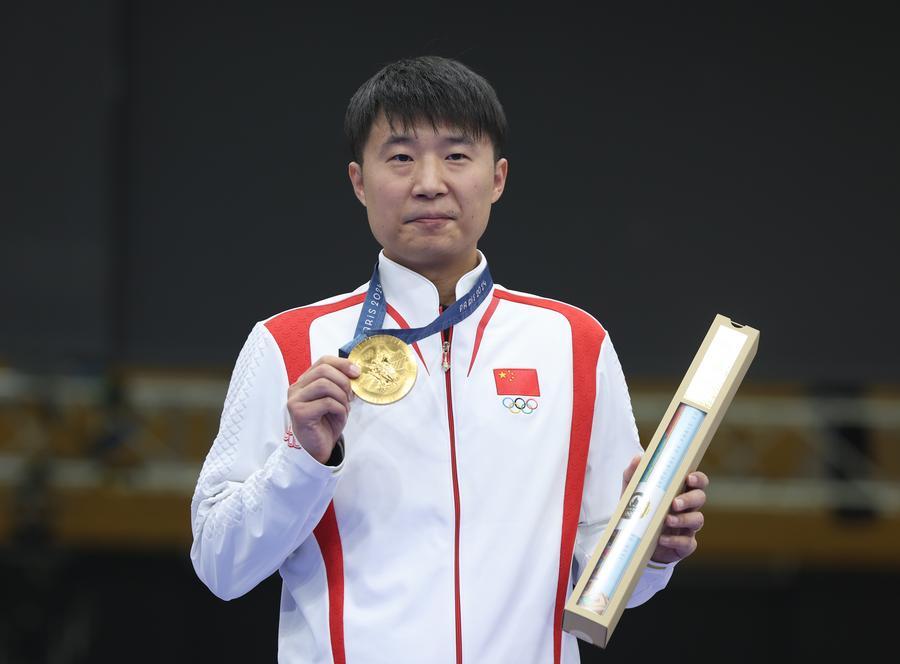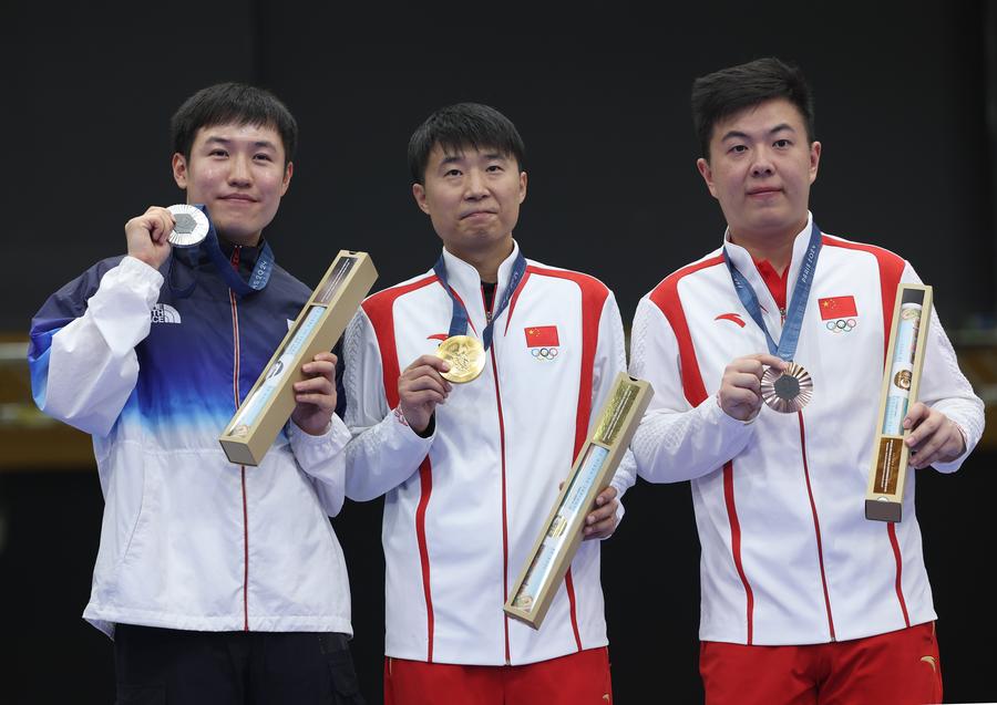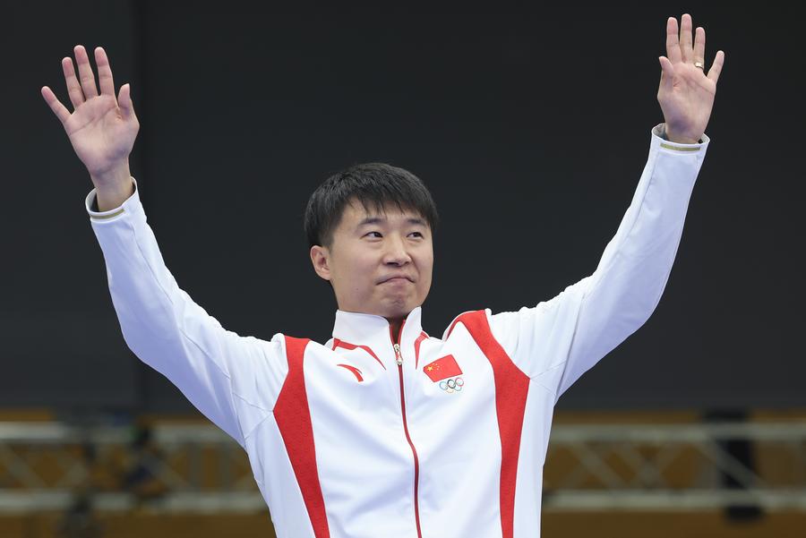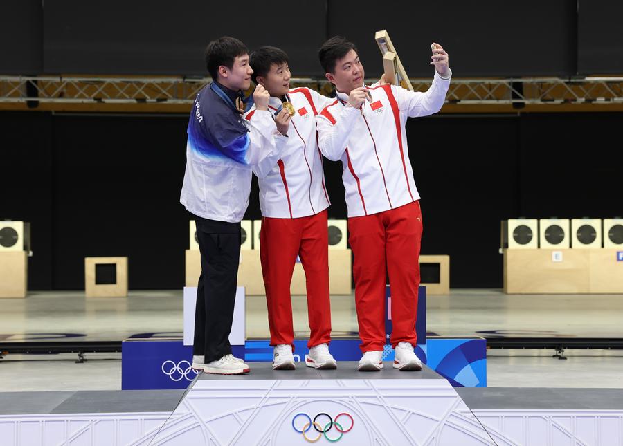 Li Yuehong of China competes during the 25m rapid fire pistol men's final of shooting at the Paris 2024 Olympic Games in Chateauroux, France, Aug. 5, 2024. (Xinhua/Zhang Fan)Li Yuehong of China reacts during the 25m rapid fire pistol men's final of shooting at the Paris 2024 Olympic Games in Chateauroux, France, Aug. 5, 2024. (Xinhua/Zhao Dingzhe)Li Yuehong (L) of China reacts during the 25m rapid fire pistol men's final of shooting at the Paris 2024 Olympic Games in Chateauroux, France, Aug. 5, 2024. (Xinhua/Zhao Dingzhe)Li Yuehong of China competes during the 25m rapid fire pistol men's final of shooting at the Paris 2024 Olympic Games in Chateauroux, France, Aug. 5, 2024. (Xinhua/Zhang Fan)Li Yuehong of China reacts during the 25m rapid fire pistol men's final of shooting at the Paris 2024 Olympic Games in Chateauroux, France, Aug. 5, 2024. (Xinhua/Zhao Dingzhe)Li Yuehong of China celebrates after the 25m rapid fire pistol men's final of shooting at the Paris 2024 Olympic Games in Chateauroux, France, Aug. 5, 2024. (Xinhua/Zhang Fan)Wang Xinjie of China competes during the 25m rapid fire pistol men's final of shooting at the Paris 2024 Olympic Games in Chateauroux, France, Aug. 5, 2024. (Xinhua/Zhao Dingzhe)Cho Yeongjae of South Korea competes during the 25m rapid fire pistol men's final of shooting at the Paris 2024 Olympic Games in Chateauroux, France, Aug. 5, 2024. (Xinhua/Zhang Fan)Gold medalist Li Yuehong of China attends the awarding ceremony after the 25m rapid fire pistol men's final of shooting at the Paris 2024 Olympic Games in Chateauroux, France, Aug. 5, 2024. (Xinhua/Zhao Dingzhe)Gold medalist Li Yuehong of China attends the awarding ceremony after the 25m rapid fire pistol men's final of shooting at the Paris 2024 Olympic Games in Chateauroux, France, Aug. 5, 2024. (Xinhua/Zhao Dingzhe)Gold medalist Li Yuehong (C) of China, silver medalist Cho Yeongjae (L) of South Korea and bronze medalist Wang Xinjie of China attend the awarding ceremony after the 25m rapid fire pistol men's final of shooting at the Paris 2024 Olympic Games in Chateauroux, France, Aug. 5, 2024. (Xinhua/Zhao Dingzhe)Gold medalist Li Yuehong (C) of China, silver medalist Cho Yeongjae (L) of South Korea and bronze medalist Wang Xinjie of China take selfies during the awarding ceremony after the 25m rapid fire pistol men's final of shooting at the Paris 2024 Olympic Games in Chateauroux, France, Aug. 5, 2024. (Xinhua/Zhang Fan)■