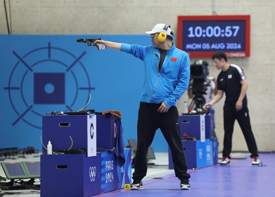 PARIS, Aug. 5 (Xinhua) -- 34-year-old Li Yuehong claimed China's fifth shooting gold at Paris 2024 after his victory in 25m rapid fire pistol here on Monday, while Armand Duplantis of Sweden cleared a world record 6.25m to triumph in the men's pole vault, breaking his own previous mark of 6.24m.
