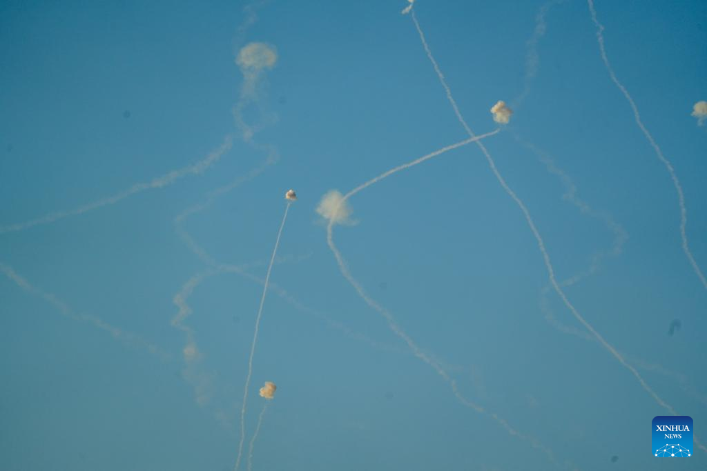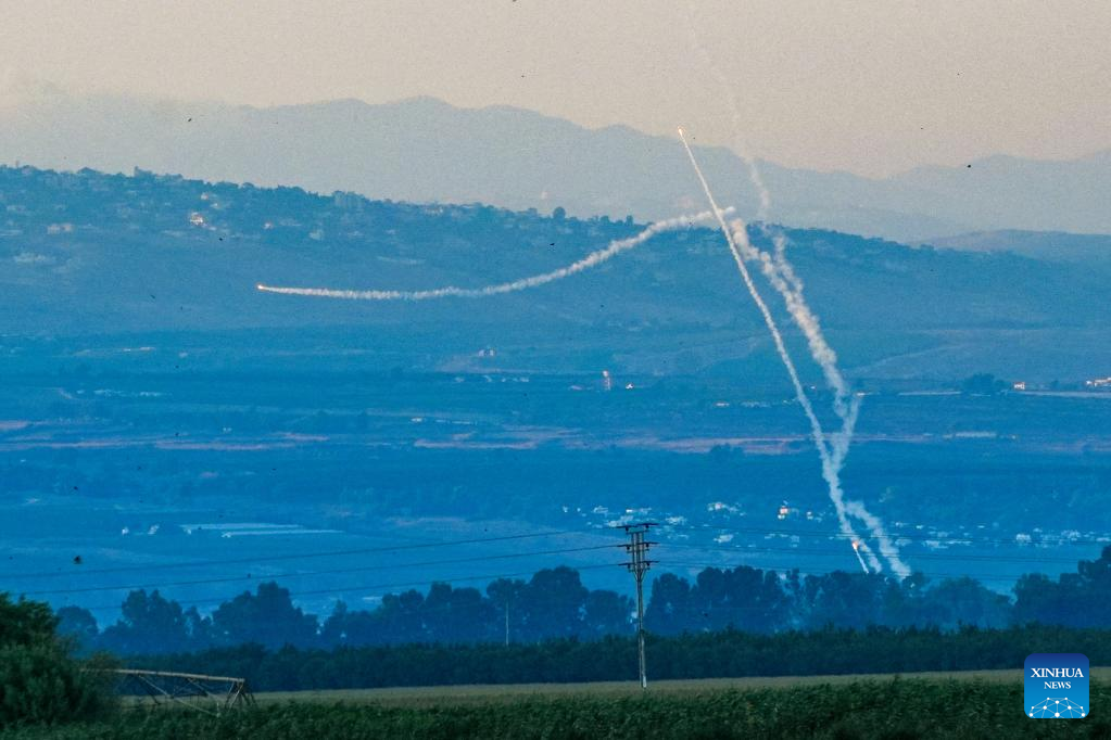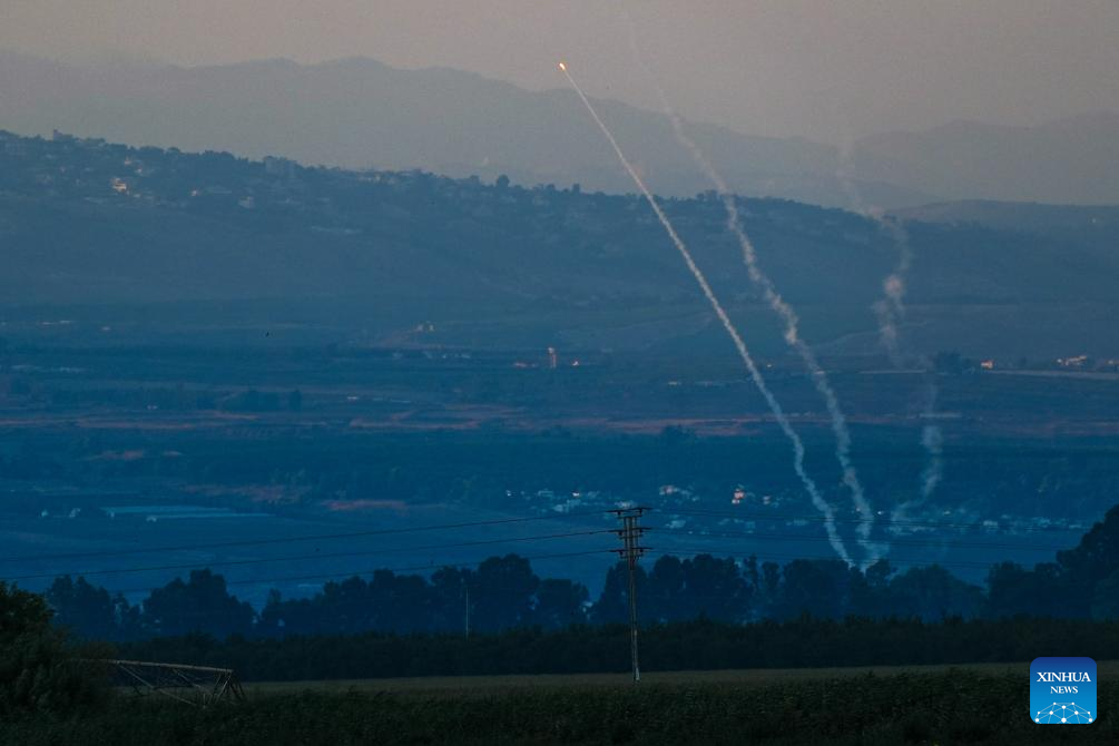 An anti-missile system intercepts rockets launched from Lebanon, as seen from Kiryat Shmona, northern Israel, on Aug. 6, 2024. Confrontations between Hezbollah and the Israeli army escalated following Israel's attack on Dahieh in Beirut's southern suburbs, killing Hezbollah senior military commander Fouad Shokor and seven civilians. (Ayal Margolin/JINI via Xinhua)