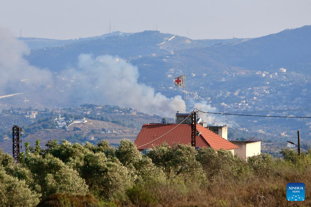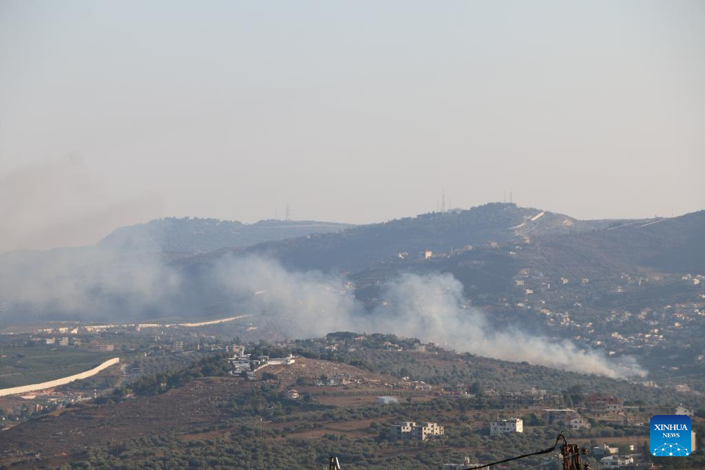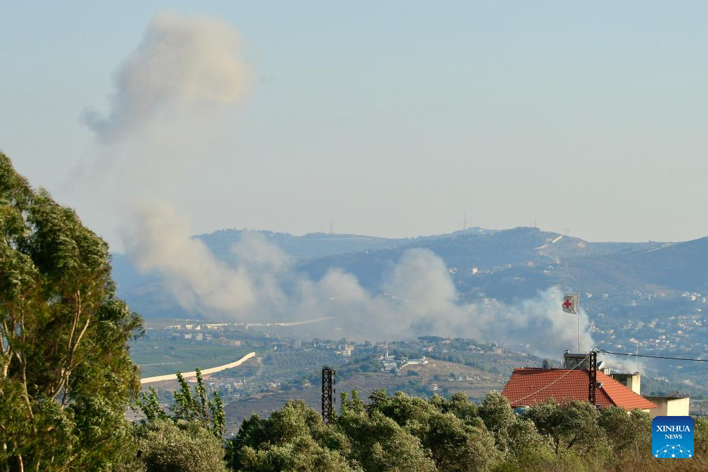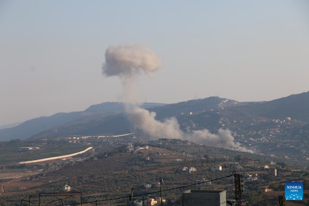 This photo shows the smoke caused by an Israeli airstrike in Kafr Kila, Lebanon, Aug. 7, 2024. Confrontations between Hezbollah and the Israeli army escalated following Israel's attack on Dahieh in Beirut's southern suburbs, killing Hezbollah senior military commander Fouad Shokor and seven civilians. (Photo by Ali Hashisho/Xinhua)
