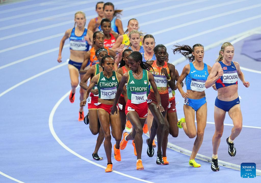 Athletes compete during the women's 5000m final of Athletics at the Paris 2024 Olympic Games in Paris, France, Aug. 5, 2024. (Xinhua/Xu Chang)