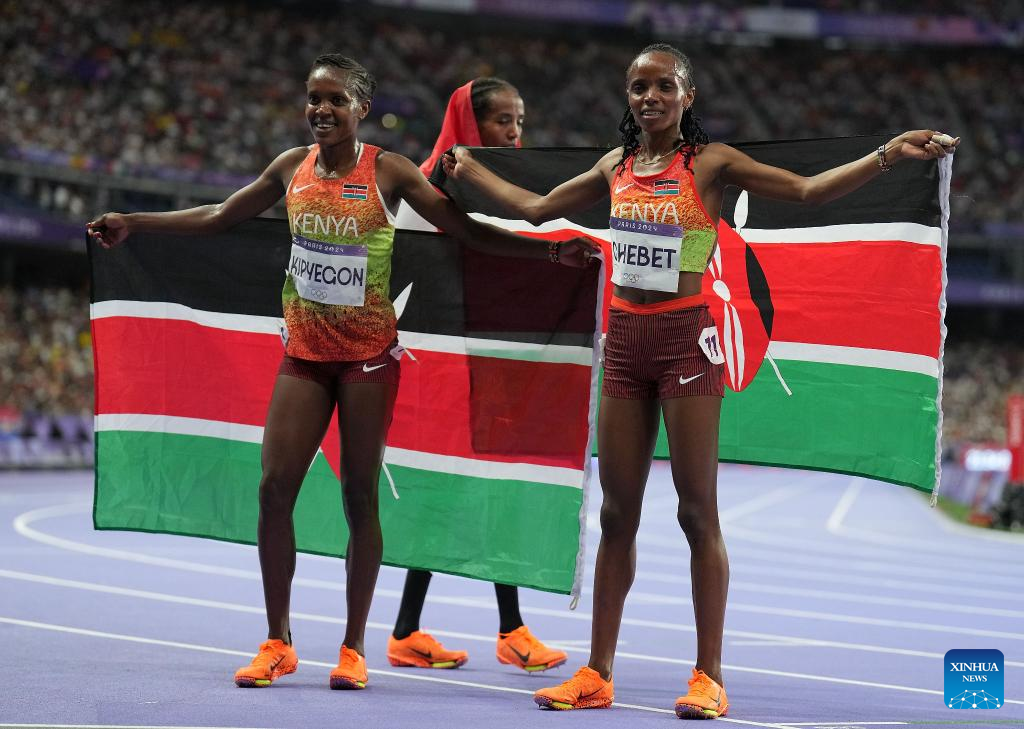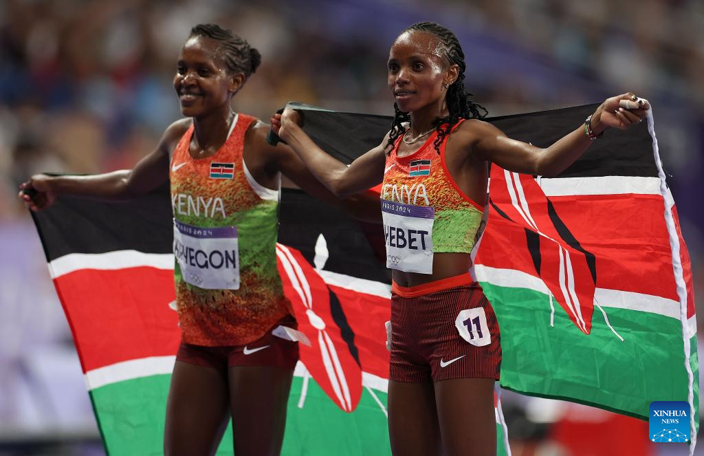 Beatrice Chebet (R) of Kenya celebrates with her teammate Faith Kipyegon after the women's 5000m final of Athletics at the Paris 2024 Olympic Games in Paris, France, Aug. 5, 2024. (Xinhua/Lui Siu Wai)