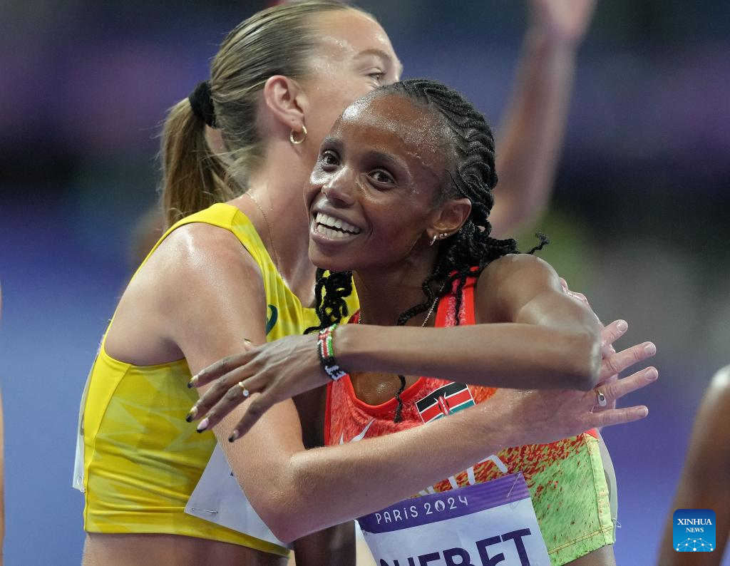 Beatrice Chebet (R) of Kenya reacts with Rose Davies of Australia after the women's 5000m final of Athletics at the Paris 2024 Olympic Games in Paris, France, Aug. 5, 2024. (Xinhua/Lui Siu Wai)