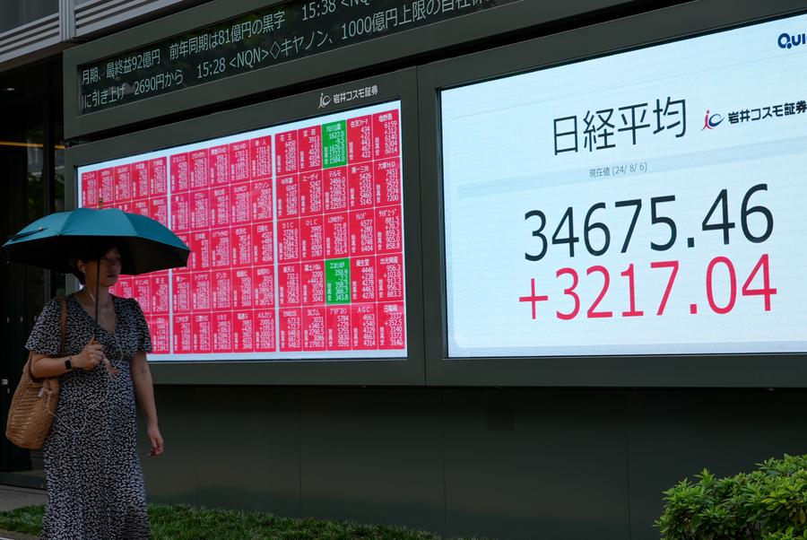 A pedestrian passes a screen showing real-time stock market information in Tokyo, Japan, Aug. 6, 2024. (Xinhua/Yue Chenxing)