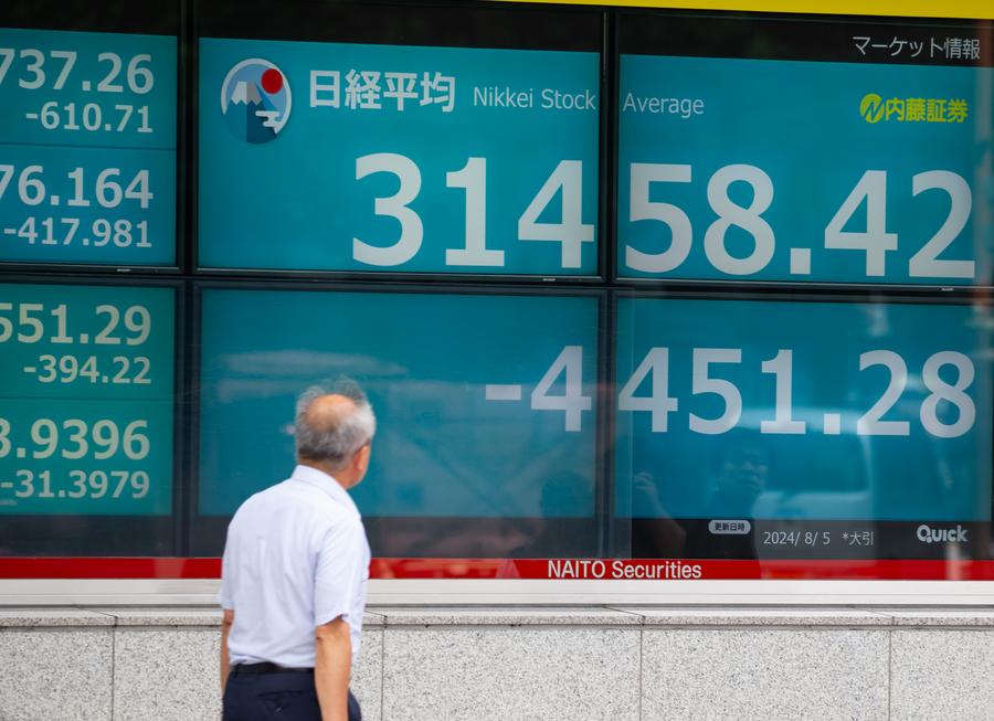 A pedestrian passes a screen showing real-time stock market information in Tokyo, Japan, Aug. 5, 2024. (Xinhua/Yue Chenxing)