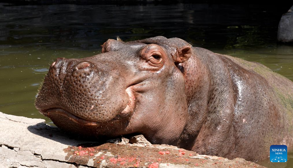 A hippo enjoys watermelon at the Tashkent Zoo in Tashkent, Uzbekistan, Aug. 6, 2024.