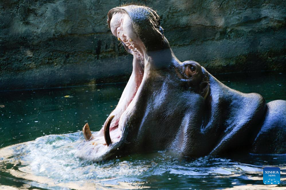A hippo cools off in a pond at the Tashkent Zoo in Tashkent, Uzbekistan, Aug. 6, 2024.