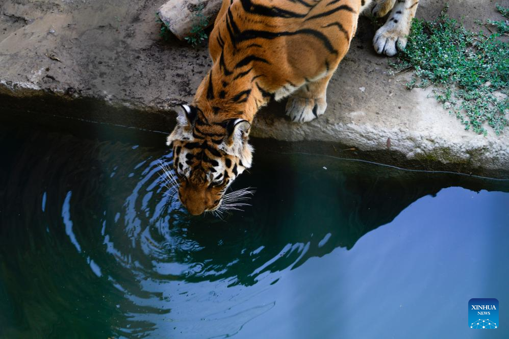 A tiger quenches its thirst at the Tashkent Zoo in Tashkent, Uzbekistan, Aug. 6, 2024.
