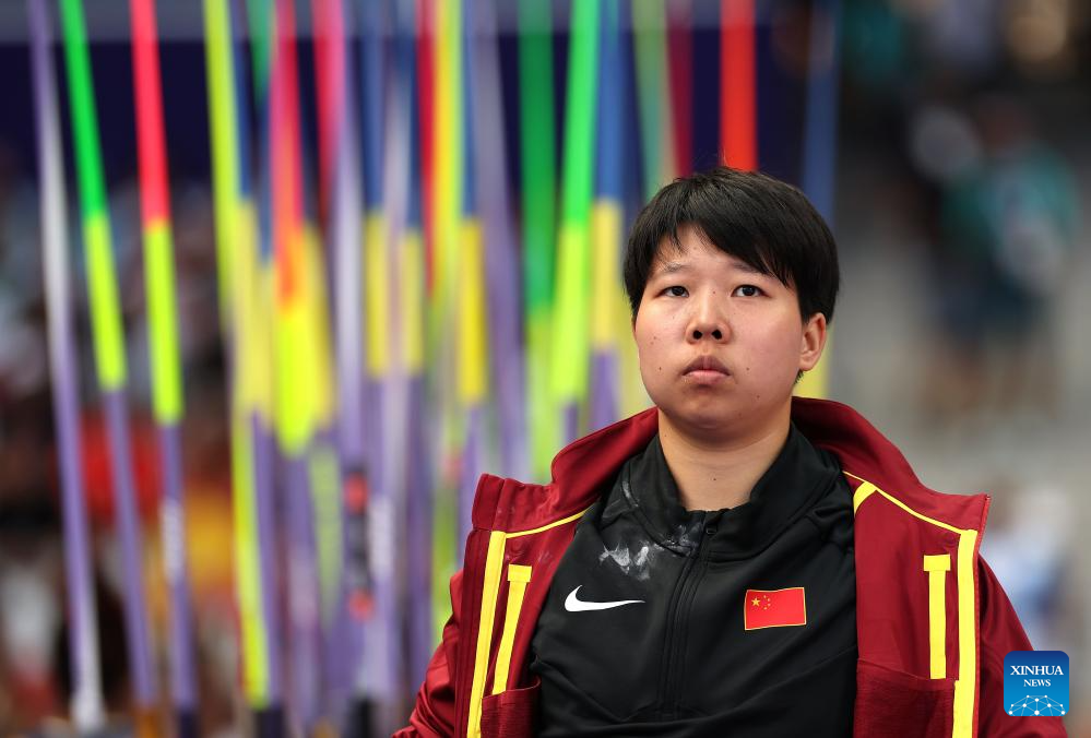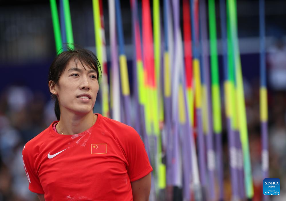 Lyu Huihui of China reacts before the women's javelin throw qualification of Athletics at the Paris 2024 Olympic Games in Paris, France, Aug. 7, 2024. (Xinhua/Li Ming)