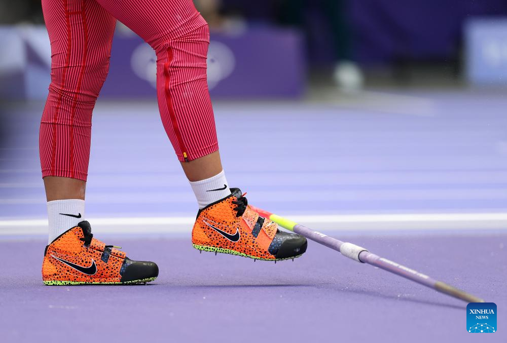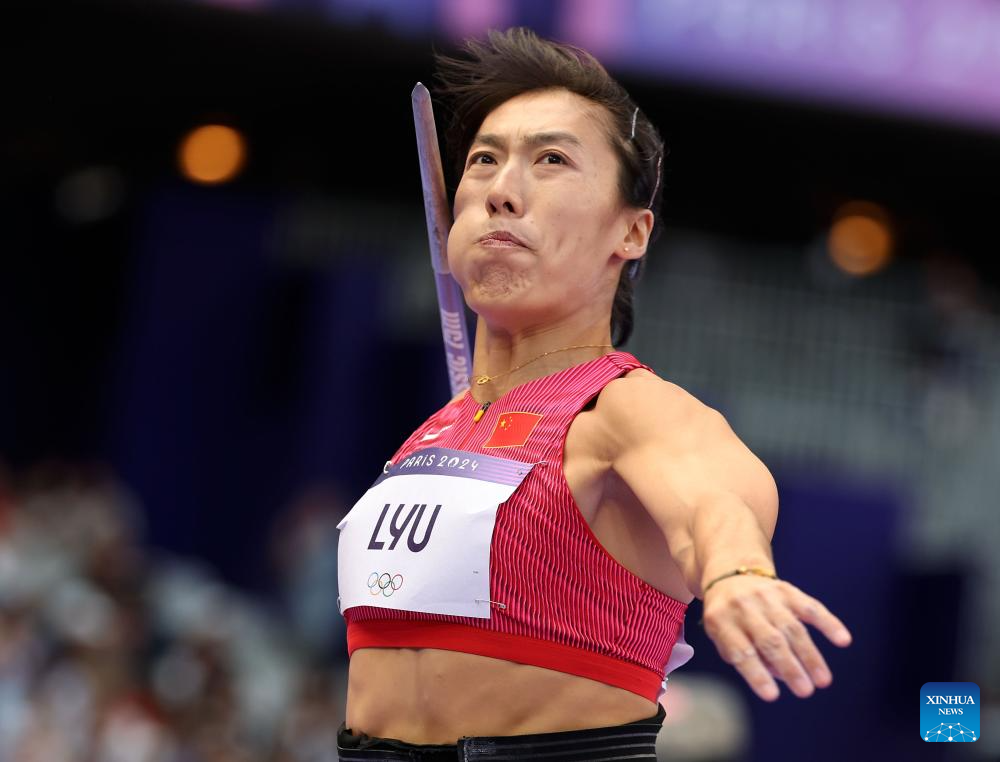 Lyu Huihui of China competes during the women's javelin throw qualification of Athletics at the Paris 2024 Olympic Games in Paris, France, Aug. 7, 2024. (Xinhua/Li Ming)