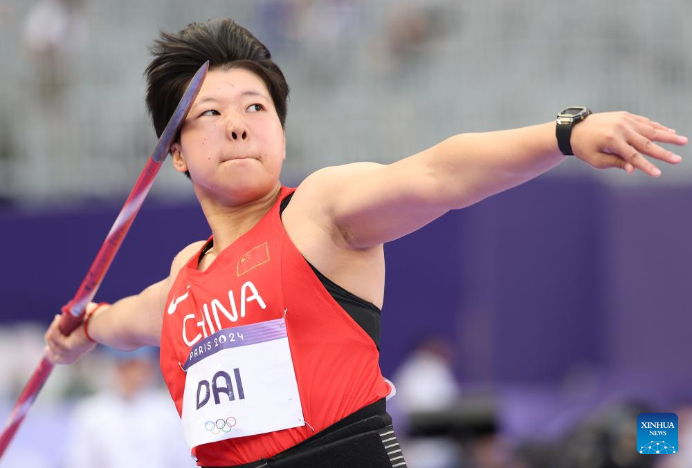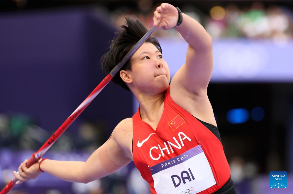 Dai Qianqian of China competes during the women's javelin throw qualification of Athletics at the Paris 2024 Olympic Games in Paris, France, Aug. 7, 2024. (Xinhua/Li Ming)