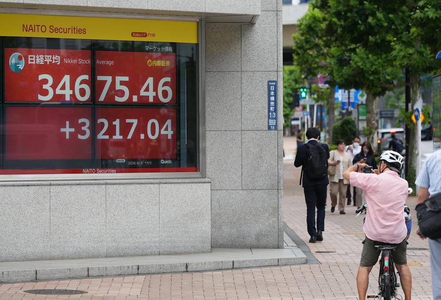 TOKYO, Aug. 7 (Xinhua) -- Tokyo stocks saw sharp rebounds on Tuesday, with the benchmark Nikkei stock index closing with its largest single-day rise in history, after a record drop of 4,451 points the previous day.