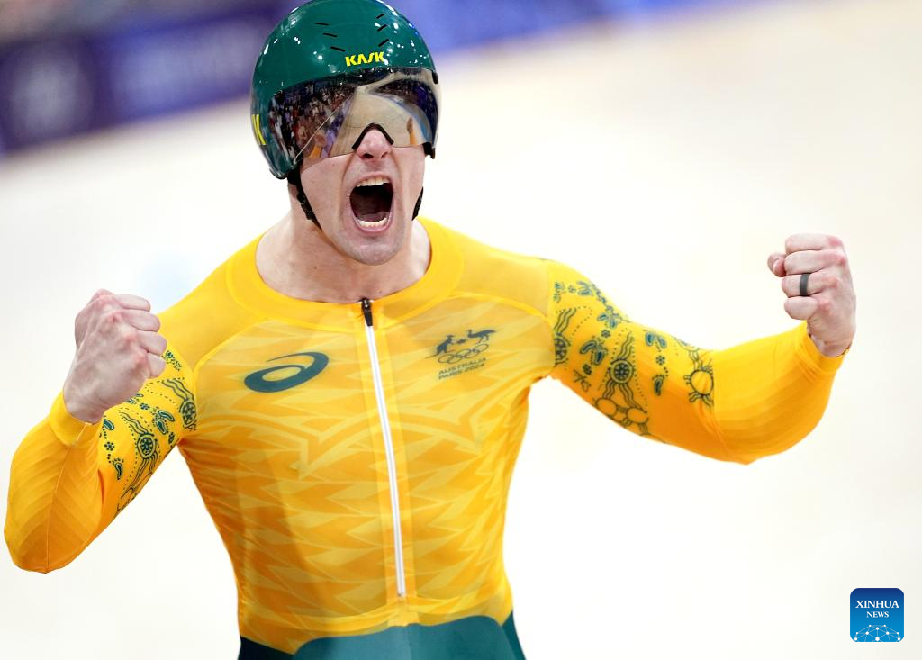 Matthew Glaetzer of Australia celebrates after winning the cycling track men's team sprint finals for bronze at the Paris 2024 Olympic Games in Paris, France, Aug. 6, 2024. (Xinhua/Li Yibo)
