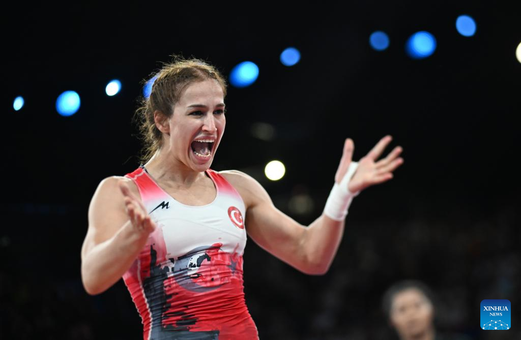 Buse Cavusoglu Tosun of Türkiye celebrates after beating Pak Sol Gum of the Democratic People's Republic of Korea in the women's freestyle 68kg bronze medal match of wrestling at the Paris 2024 Olympic Games in Paris, France, Aug. 6, 2024. (Xinhua/Wu Wei)