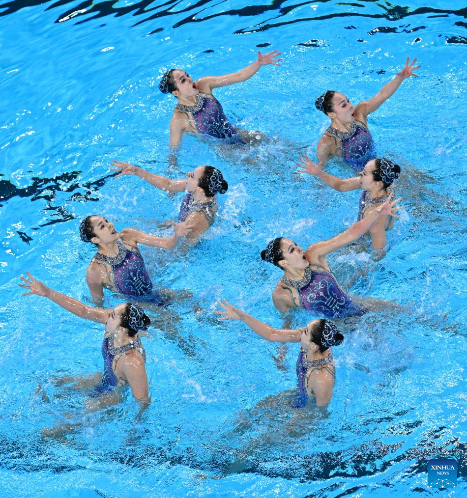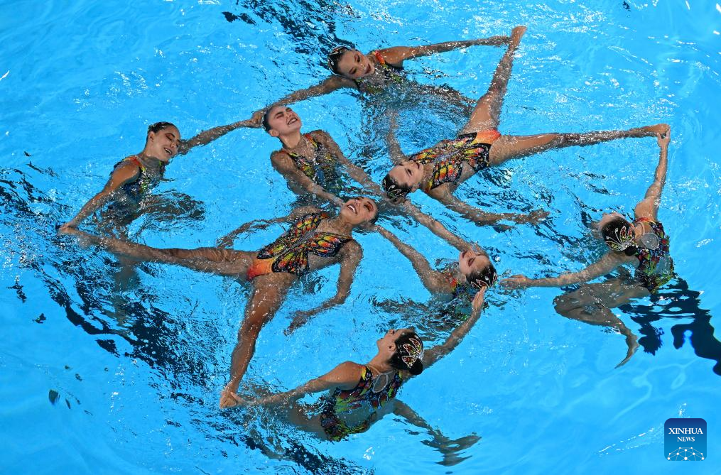 (240806) -- SAINT-DENIS, Aug. 6, 2024 (Xinhua) -- Team Mexico compete during the team free routine of artistic swimming at the Paris 2024 Olympic Games in Saint-Denis, France, on Aug. 6, 2024. (Xinhua/Xia Yifang)