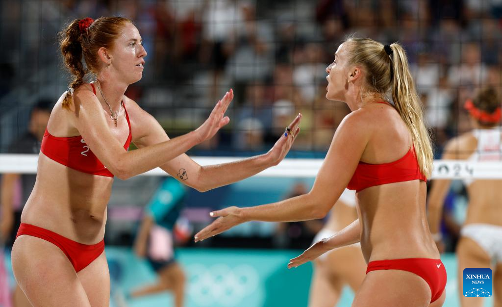 Sara Hughes (R)/Kelly Cheng of the United States celebrate scoring during the beach volleyball women's quarterfinal against Tanja Hueberli/Nina Brunner of Switzeland at the Paris 2024 Olympic Games in Paris, France, Aug. 6, 2024. (Xinhua/Fei Maohua)