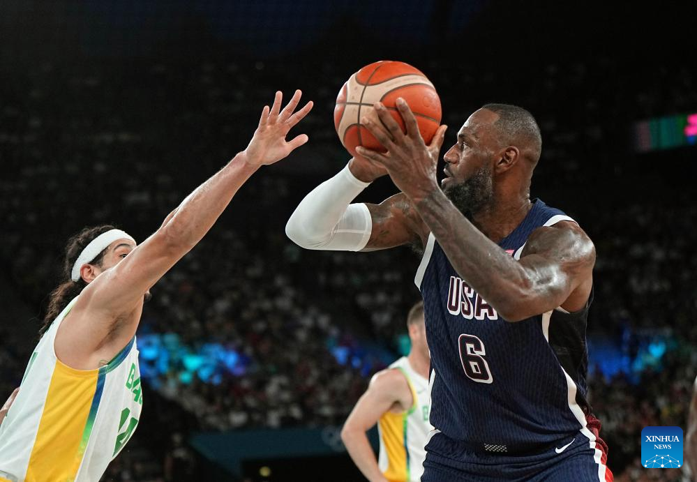 LeBron James (R) of the United States competes during the men's basketball quarterfinal between Brazil and the United States at the Paris 2024 Olympic Games in Paris, France, on Aug. 6, 2024. (Xinhua/Meng Yongmin)