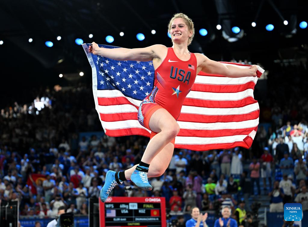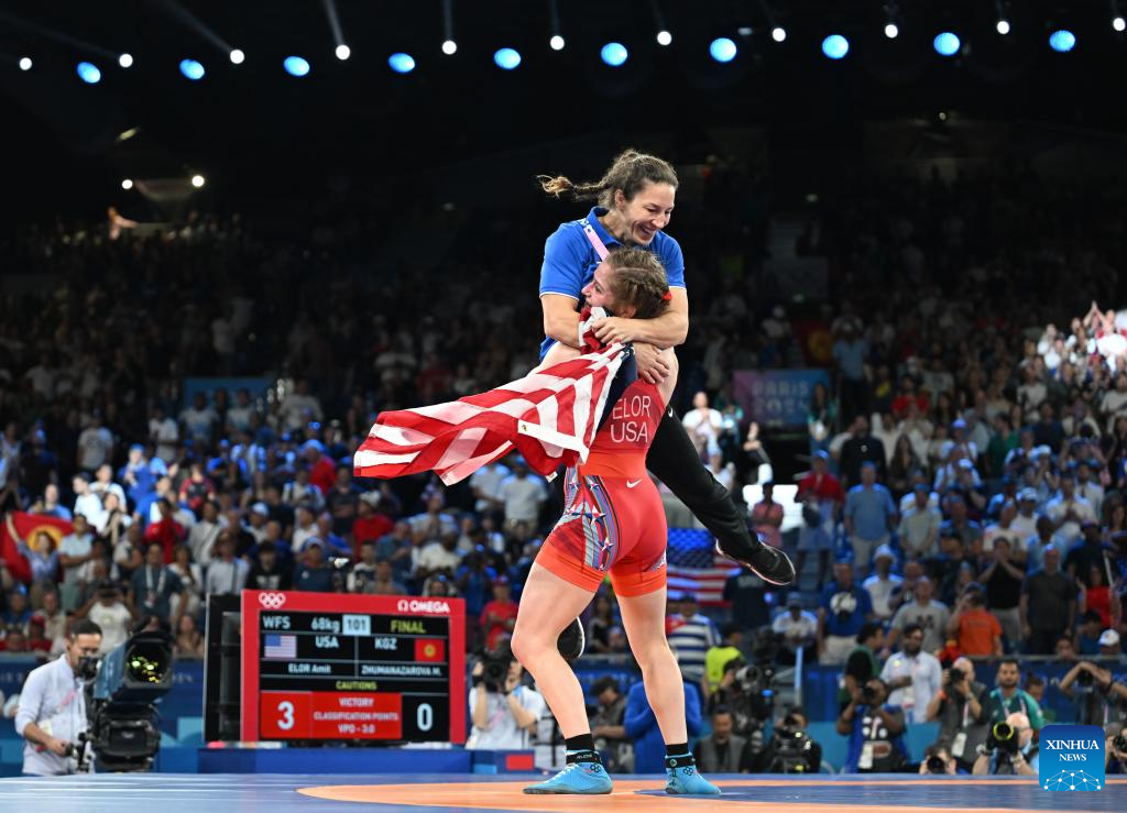 Amit Elor of the United States celebrates after beating Meerim Zhumanazarova of Kyrgyzstan during the women's freestyle 68kg final match of wrestling at the Paris 2024 Olympic Games in Paris, France, Aug. 6, 2024. (Xinhua/Wu Wei)