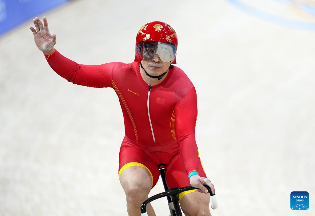 Guo Shuai of China reacts after the cycling track men's team sprint first round at the Paris 2024 Olympic Games in Paris, France, Aug. 6, 2024. (Xinhua/Li Yibo)