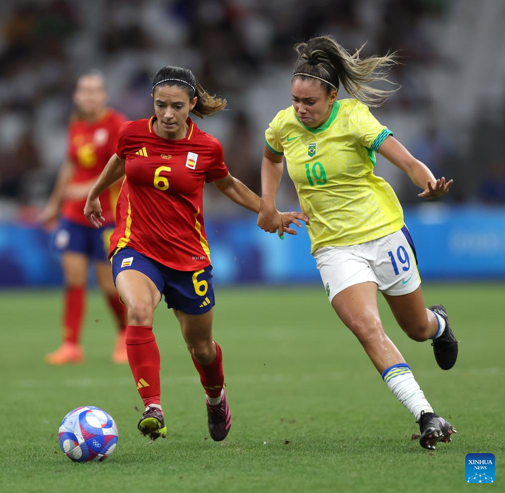 (240806) -- MARSEILLE, Aug. 6, 2024 (Xinhua) -- Aitana Bonmati (L) of Spain vies with Priscila of Brazil during the women's semi-final match of football between Brazil and Spain of Paris 2024 Olympic Games in Marseille, France, Aug. 6, 2024. (Xinhua/Huang Zongzhi)
