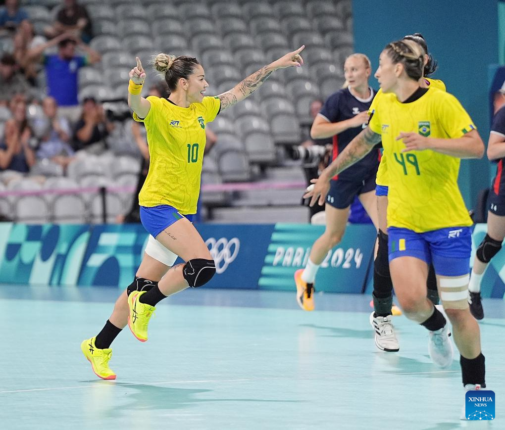 (240806) -- LILLE, Aug. 6, 2024 (Xinhua) -- Jessica Quintino (L) of Brazil celebrates scoring during the women's quarterfinal of handball between Norway and Brazil at the Paris 2024 Olympic Games in Lille, France, on Aug. 6, 2024. (Xinhua/Meng Dingbo)