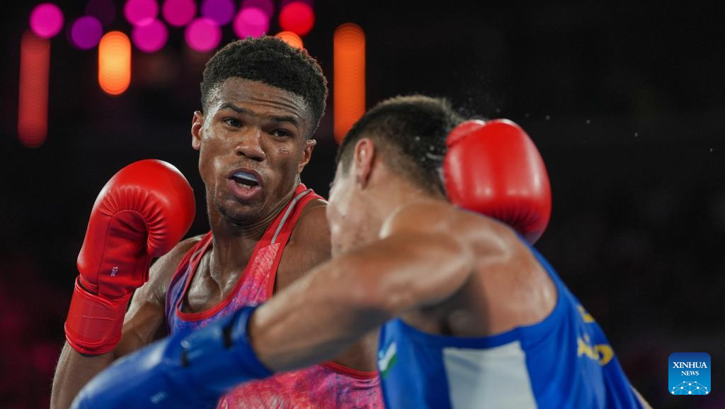 Asadkhuja Muydinkhujaev (in blue) of Uzbekistan competes against Omari Jones of the United States during the men's boxing 71kg semifinal at the Paris 2024 Olympic Games in Paris, France, Aug. 6, 2024. (Xinhua/Jiang Wenyao)