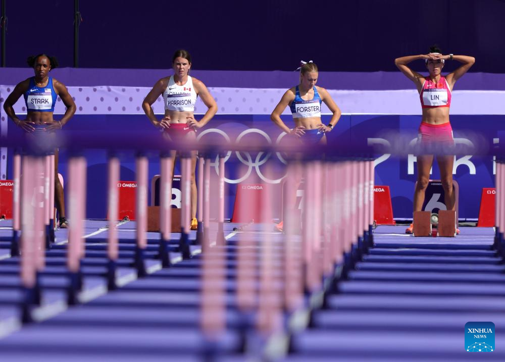 Lin Yuwei (C) of China reacts before the women's 100m hurdles round 1 of Athletics at the Paris 2024 Olympic Games in Paris, France, Aug. 7, 2024. (Xinhua/Lui Siu Wai)
