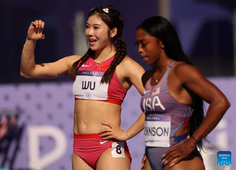 Wu Yanni (L) of China reacts before the women's 100m hurdles round 1 of Athletics at the Paris 2024 Olympic Games in Paris, France, Aug. 7, 2024. (Xinhua/Li Ming)