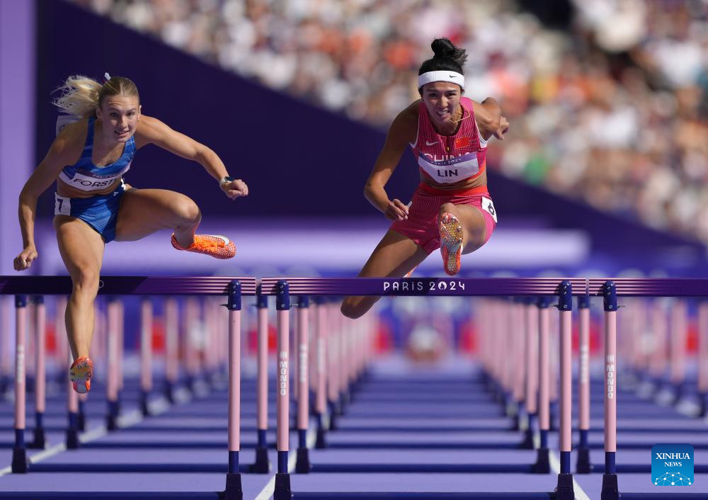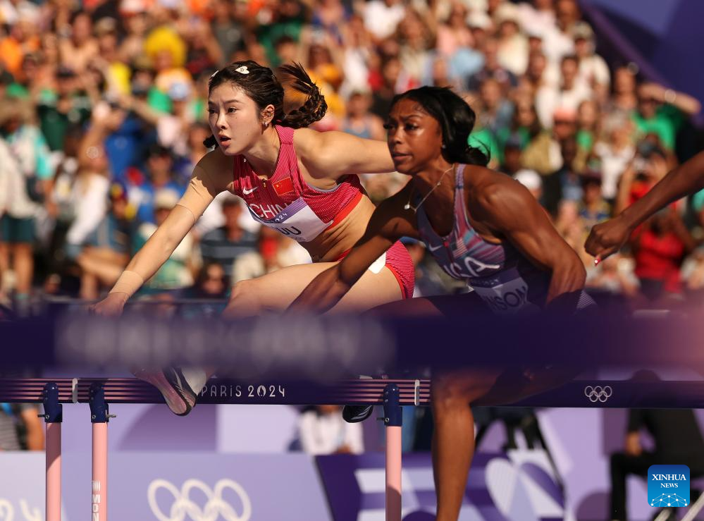 Lin Yuwei (R) of China competes during the women's 100m hurdles round 1 of Athletics at the Paris 2024 Olympic Games in Paris, France, Aug. 7, 2024. (Xinhua/Lui Siu Wai)