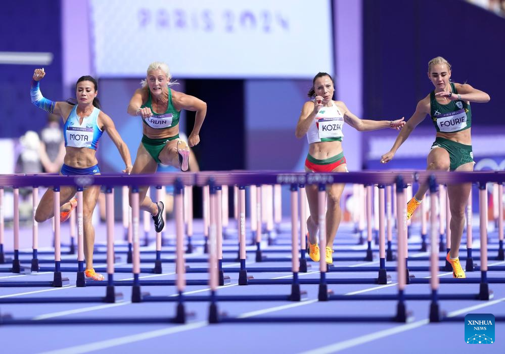 Sarah Lavin (2nd L) of Ireland competes during the women's 100m hurdles round 1 of Athletics at the Paris 2024 Olympic Games in Paris, France, Aug. 7, 2024. (Xinhua/Lui Siu Wai)