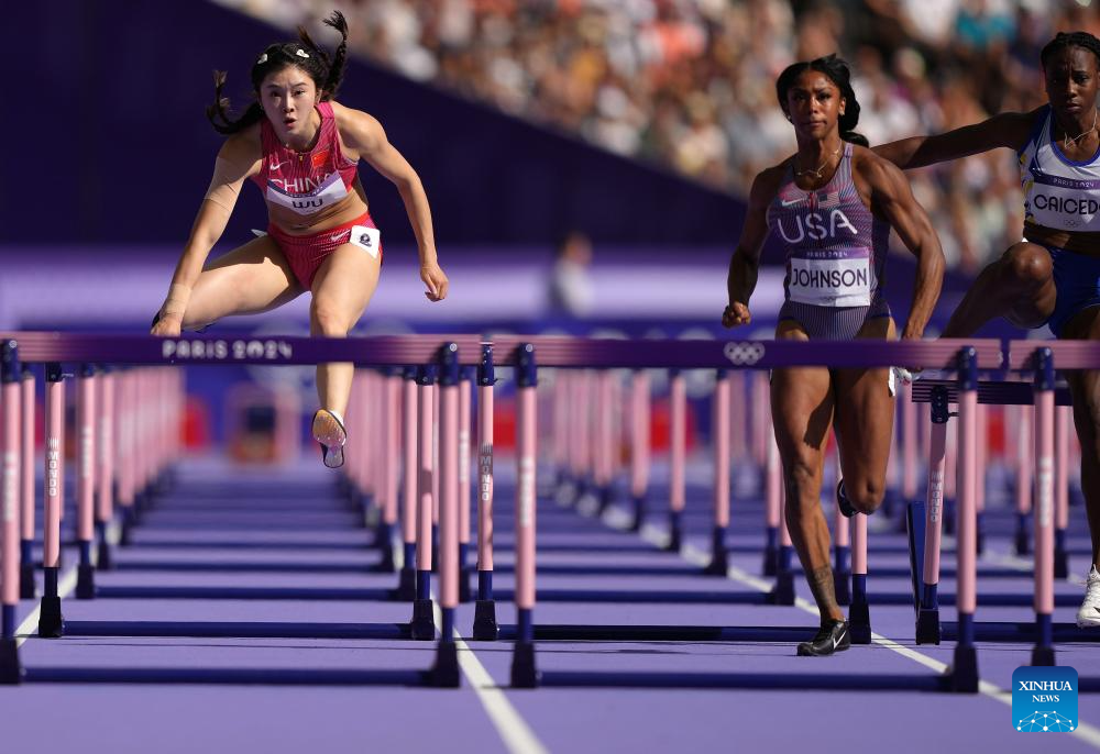 Wu Yanni (L) of China and Alaysha Johnson (C) of the United States compete during the women's 100m hurdles round 1 of Athletics at the Paris 2024 Olympic Games in Paris, France, Aug. 7, 2024. (Xinhua/Lui Siu Wai)