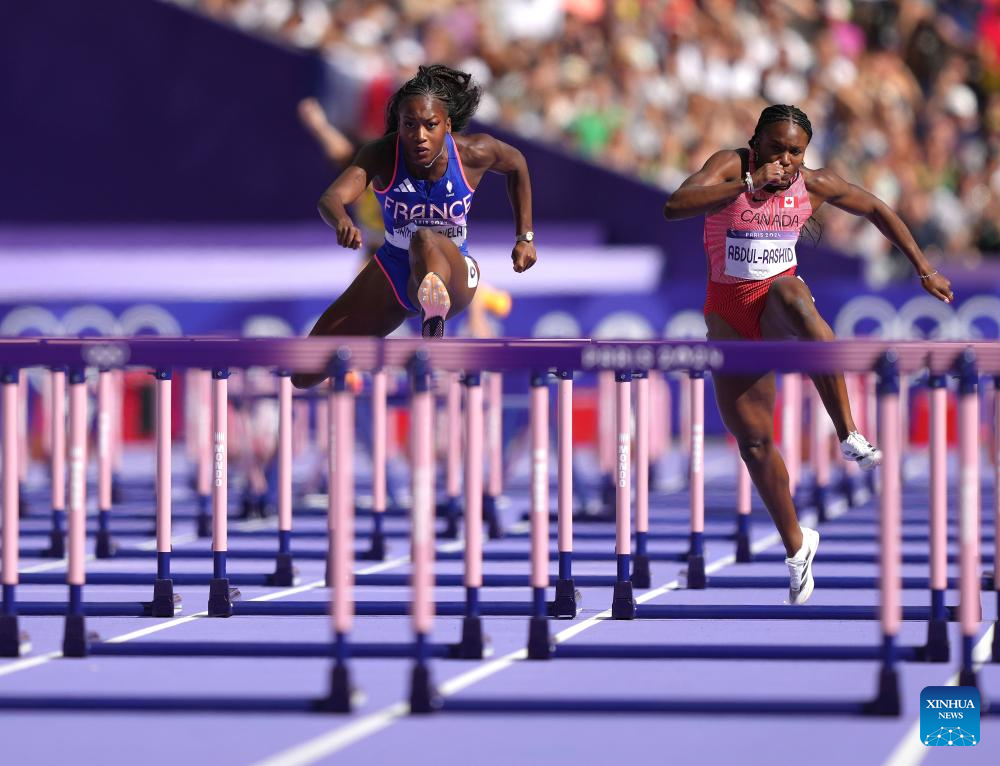Cyrena Samba-Mayela (L) of France and Mariam Abdul-Rashid of Canada compete during the women's 100m hurdles round 1 of Athletics at the Paris 2024 Olympic Games in Paris, France, Aug. 7, 2024. (Xinhua/Lui Siu Wai)