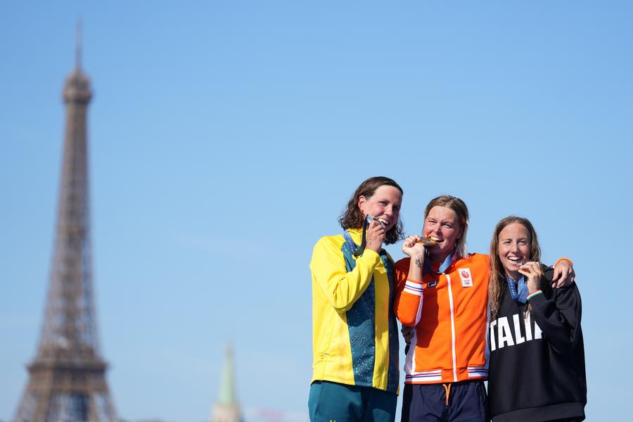 PARIS, Aug. 8 (Xinhua) -- Sharon van Rouwendaal of the Netherlands showed her experience in the field of open water and clinched the women's 10km marathon swimming gold medal in the River Seine at the Paris Olympic Games here on Thursday morning.
