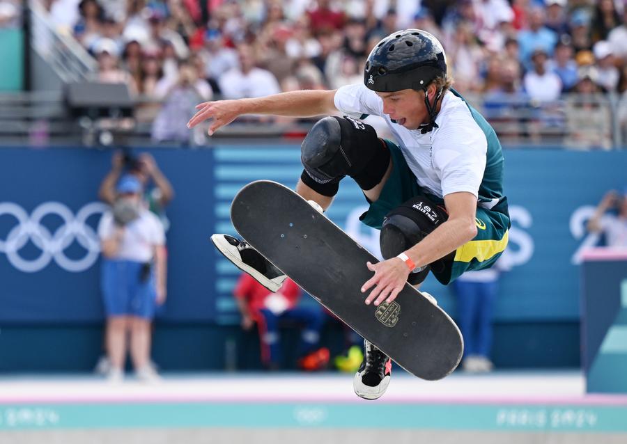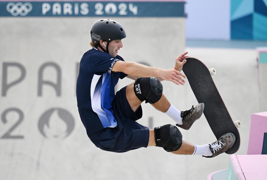 PARIS, Aug. 7 (Xinhua) -- Australia's Keegan Palmer defended his title in the men's park final on Wednesday against strong Brazilian and American peers, wrapping up the skateboarding competitions at Paris 2024.