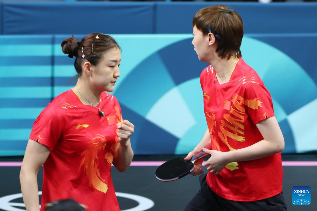 Chen Meng (L)/Wang Manyu of China react while competing against Chen Szu-Yu/Chien Tung-Chuan of Chinese Taipei during the women's team quarterfinal of table tennis between China and Chinese Taipei at the Paris 2024 Olympic Games in Paris, France, on Aug. 7, 2024. (Xinhua/Liu Xu)