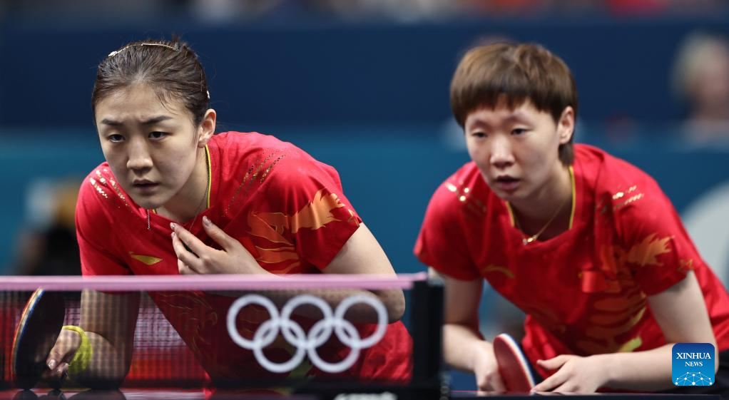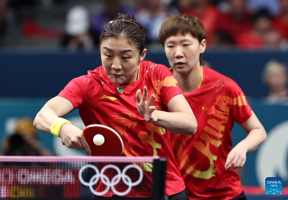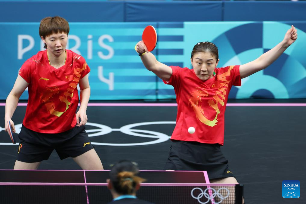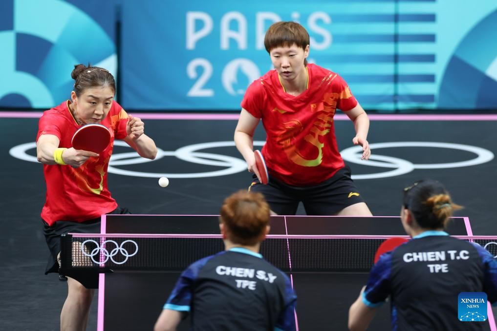 Chen Meng (R)/Wang Manyu of China compete against Chen Szu-Yu/Chien Tung-Chuan of Chinese Taipei during the women's team quarterfinal of table tennis between China and Chinese Taipei at the Paris 2024 Olympic Games in Paris, France, on Aug. 7, 2024. (Xinhua/Liu Xu)