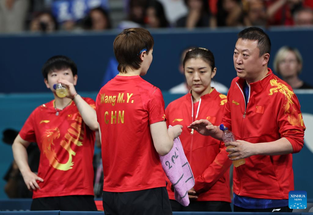 Coach Ma Lin (1st R) gives instructions to Wang Manyu (2nd L) during the women's team quarterfinal of table tennis between China and Chinese Taipei at the Paris 2024 Olympic Games in Paris, France, on Aug. 7, 2024. (Xinhua/Wang Dongzhen)
