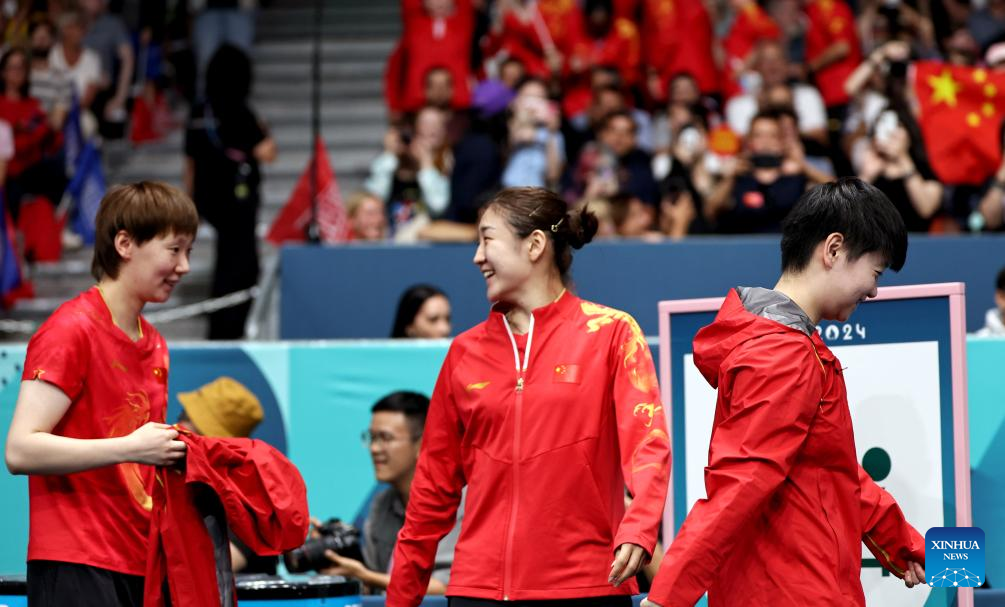 Sun Yingsha (R), Wang Manyu (L) and Chen Meng of China leave after the women's team quarterfinal of table tennis between China and Chinese Taipei at the Paris 2024 Olympic Games in Paris, France, on Aug. 7, 2024. (Xinhua/Wang Dongzhen)