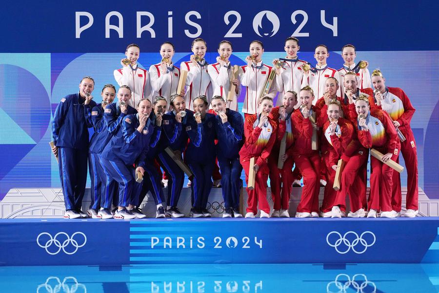 Gold medalists team China (top), silver medalists team USA (lower L) and bronze medalists team Spain show their medals during the victory ceremony for the team acrobatic routine of artistic swimming at the Paris 2024 Olympic Games in Saint-Denis, France, Aug. 7, 2024. (Xinhua/Xue Yuge)Gold medalists team China show their medals after the victory ceremony for the team acrobatic routine of artistic swimming at the Paris 2024 Olympic Games in Saint-Denis, France, Aug. 7, 2024. (Xinhua/Xue Yuge)Team China react after knowing their scores during the team acrobatic routine of artistic swimming at the Paris 2024 Olympic Games in Saint-Denis, France, Aug. 7, 2024. (Xinhua/Xue Yuge)Team China compete during the team acrobatic routine of artistic swimming at the Paris 2024 Olympic Games in Saint-Denis, France, Aug. 7, 2024. (Xinhua/Xue Yuge)Team China compete during the team acrobatic routine of artistic swimming at the Paris 2024 Olympic Games in Saint-Denis, France, Aug. 7, 2024. (Xinhua/Xue Yuge)Team China celebrate victory in the team acrobatic routine of artistic swimming at the Paris 2024 Olympic Games in Saint-Denis, France, Aug. 7, 2024. (Xinhua/Xue Yuge)Team China compete during the team acrobatic routine of artistic swimming at the Paris 2024 Olympic Games in Saint-Denis, France, Aug. 7, 2024. (Xinhua/Xue Yuge)■