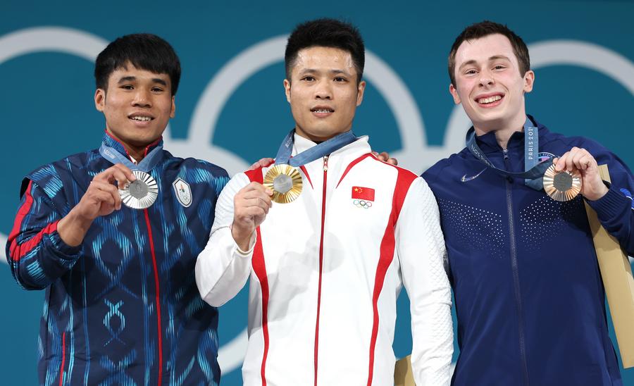 Gold medalist Li Fabin of China poses for photos during the victory ceremony of weightlifting men's 61kg competition at the Paris 2024 Olympic Games in Paris, France, on Aug. 7, 2024. (Xinhua/Yang Lei)